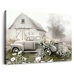 Size: 16x12in, 1 panel, This framed canvas art showcases a misty countryside field landscape with a rustic farmhouse barn and a vintage old truck loaded with flowers, adding a touch of serene rural charm to any space
